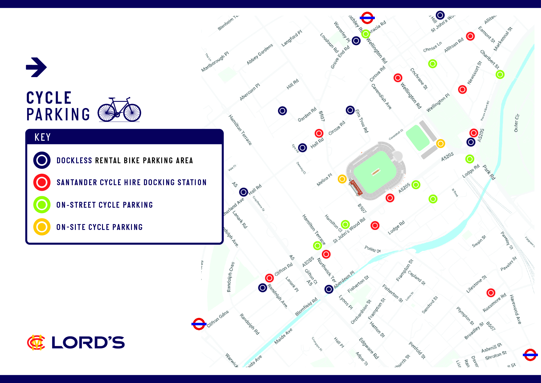 There are several Cycle Hire docking stations within five minutes’ walk of the Ground, on Abbey Road, St John’s Wood Road, Wellington Road, Lodge Road, Lisson Grove and Prince Albert Road.