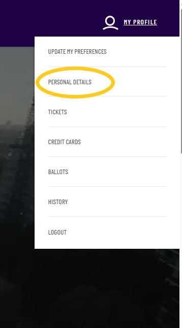 - Hover over ‘MY PROFILE’ in the top-right-hand corner of the page and select ‘PERSONAL DETAILS’ from the drop-down menu.